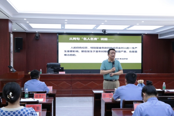 仪式结束后,湖南省特级教师、湘西自治州教师发展中心原主任符顺忠为宣讲团成员进行了培训。课堂上,符顺忠以《讲好法治故事,护航学生成长》为题,从背景概述、课程设计、宣讲建议等方面进行讲授,帮助宣讲团成员树立法治宣讲思维,掌握法治宣讲技巧,提升法治宣讲工作质效。