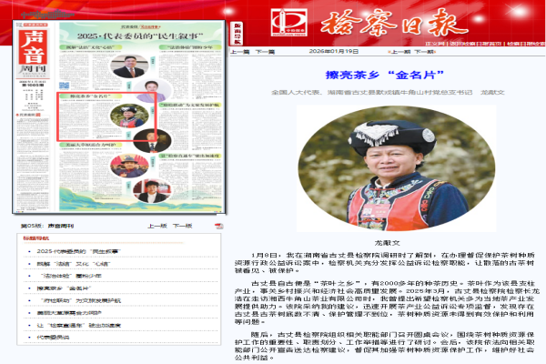 古丈县自古便是“茶叶之乡”,有2000多年的种茶历史。茶叶作为该县支柱产业,事关乡村振兴和经济社会高质量发展。2025年3月,古丈县检察院检察长龙浩在走访湘西牛角山茶业有限公司时,我曾提出希望检察机关多为当地茶产业发展提供助力。该院采纳我的建议,迅速开展茶产业公益诉讼专项监督,发现存在古丈县古茶树底数不清、保护管理不到位,茶树种质资源未得到有效保护和利用等问题。